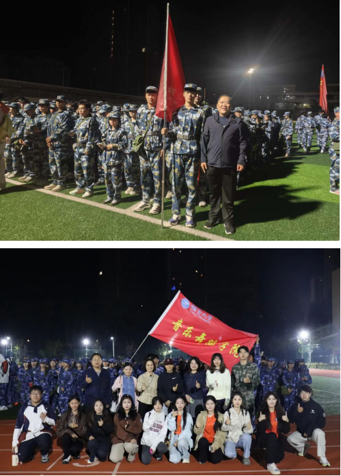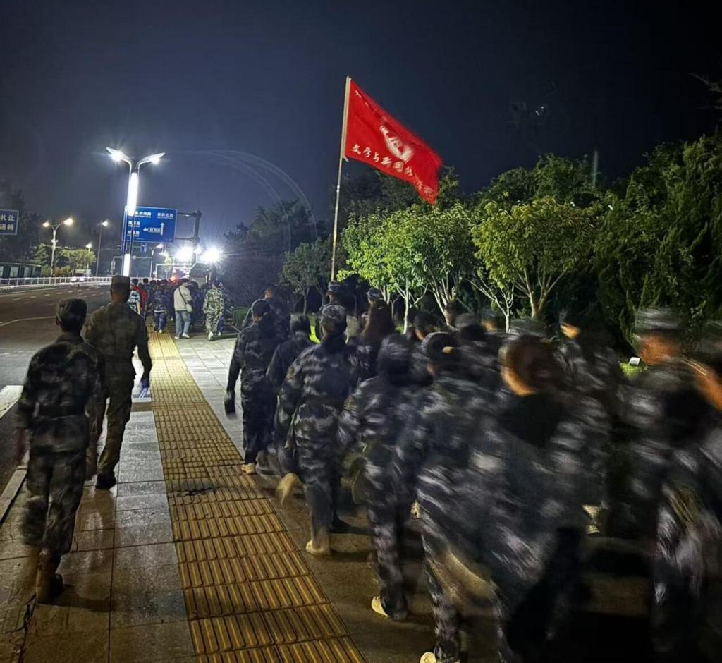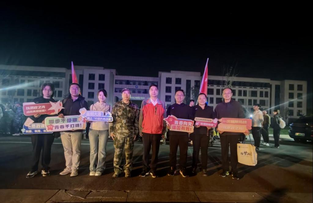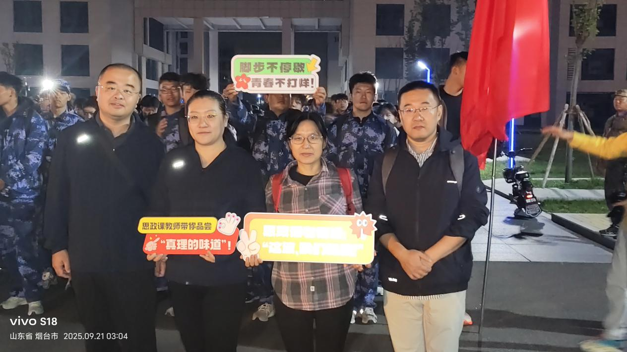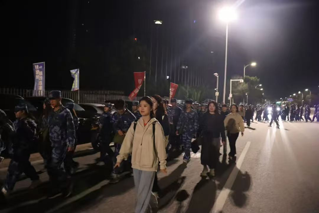 夜色中的海湾静谧深邃,新生们身着统一服装,迎着微凉海风高唱校歌,迈着坚定步伐向终点进发。思政课教师们主动穿插在队伍中,形成“师生同行”的暖心阵容:有的俯身搀扶体力不支的同学,递上温水补充能量;有的与学生并肩前行,从拉练感悟聊到人生规划。