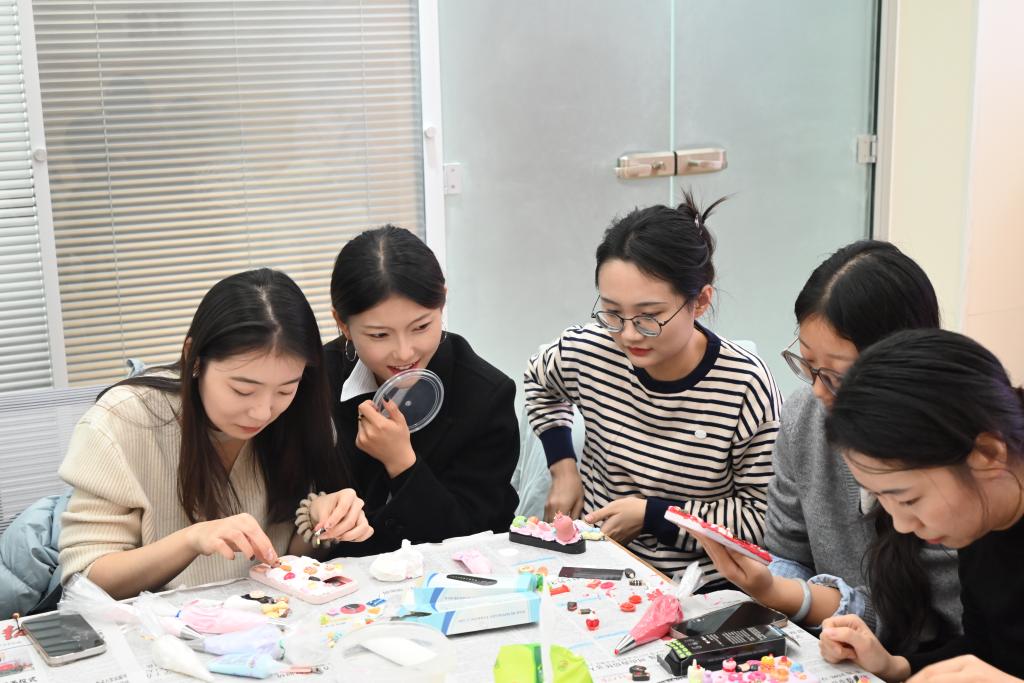 在奶油胶手工DIY活动中,在了解创作技巧、色彩搭配原则、装饰、定型等关键步骤后,同学们充分发挥创意,认真挑选心仪的奶油胶颜色与装饰配件,勾勒线条、粘贴摆件,设计出风格各异的发卡、收纳盒等。在创作过程中,同学们不时交流技巧、分享灵感,在协作互动中拉近了彼此距离。
