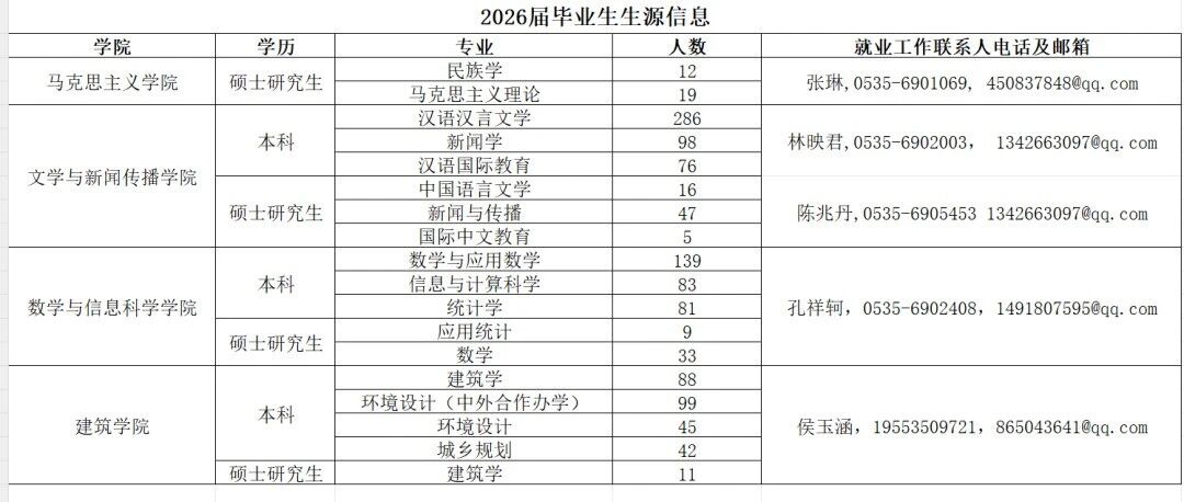 为了在用人单位和毕业生之间搭建更高效的交流平台,提供优质、贴心的就业服务,进一步推动2026届毕业生就业工作,在烟台大学就业工作指导中心的支持下,马克思主义学院、文学与新闻传播学院、数学与信息科学学院、建筑学院,拟于2025年12月30日(周二)联合举办烟台大学“数智文心•思建未来”2026届毕业生专场招聘会。诚邀相关企事业单位前来学校招贤纳士,我们将竭诚为您提供服务。期待您的莅临参会,现将相关事宜说明如下: