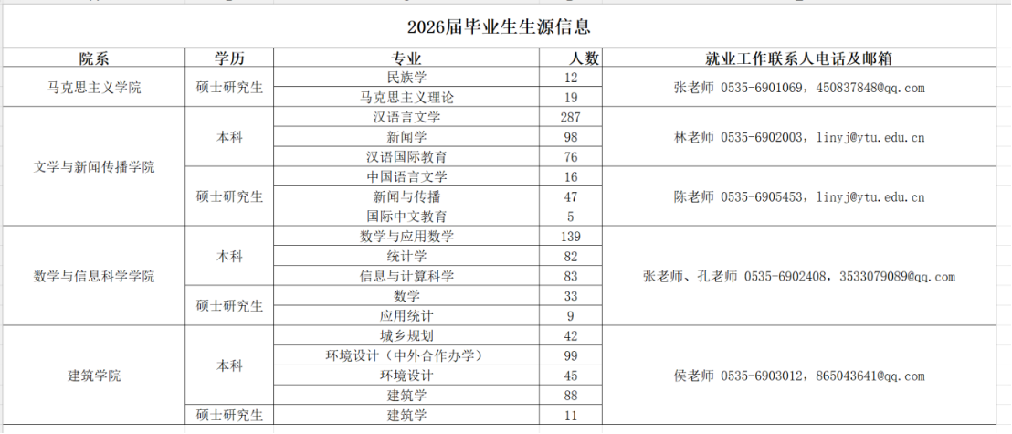 为精准搭建校企人才对接桥梁,高效匹配企业用人需求与毕业生就业诉求,助力2026届毕业生高质量就业,在烟台大学就业工作指导中心统筹支持下,马克思主义学院、文学与新闻传播学院、数学与信息科学学院、建筑学院,拟于2026年4月16日联合举办“数智文心•思建未来”2026届毕业生专场招聘会。诚邀各优质企事业单位莅临烟园招贤纳士,我校将全程提供贴心周到的会务服务,期待您的莅临参会,现将相关事宜说明如下: